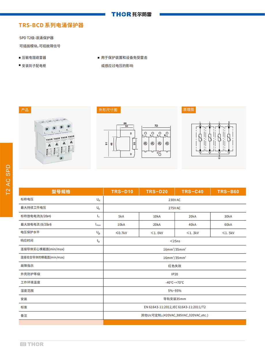 TRS-D系列電涌保護(hù)器(以下簡(jiǎn)稱(chēng)SPD)適用于交流50/60Hz,額定電壓至380V的IT、TT、TN-C、 TN-S、TN-C-S,等供電系統(tǒng),對(duì)間接雷電和直接雷電影響或其他瞬時(shí)過(guò)電壓的電涌進(jìn)行保護(hù)。